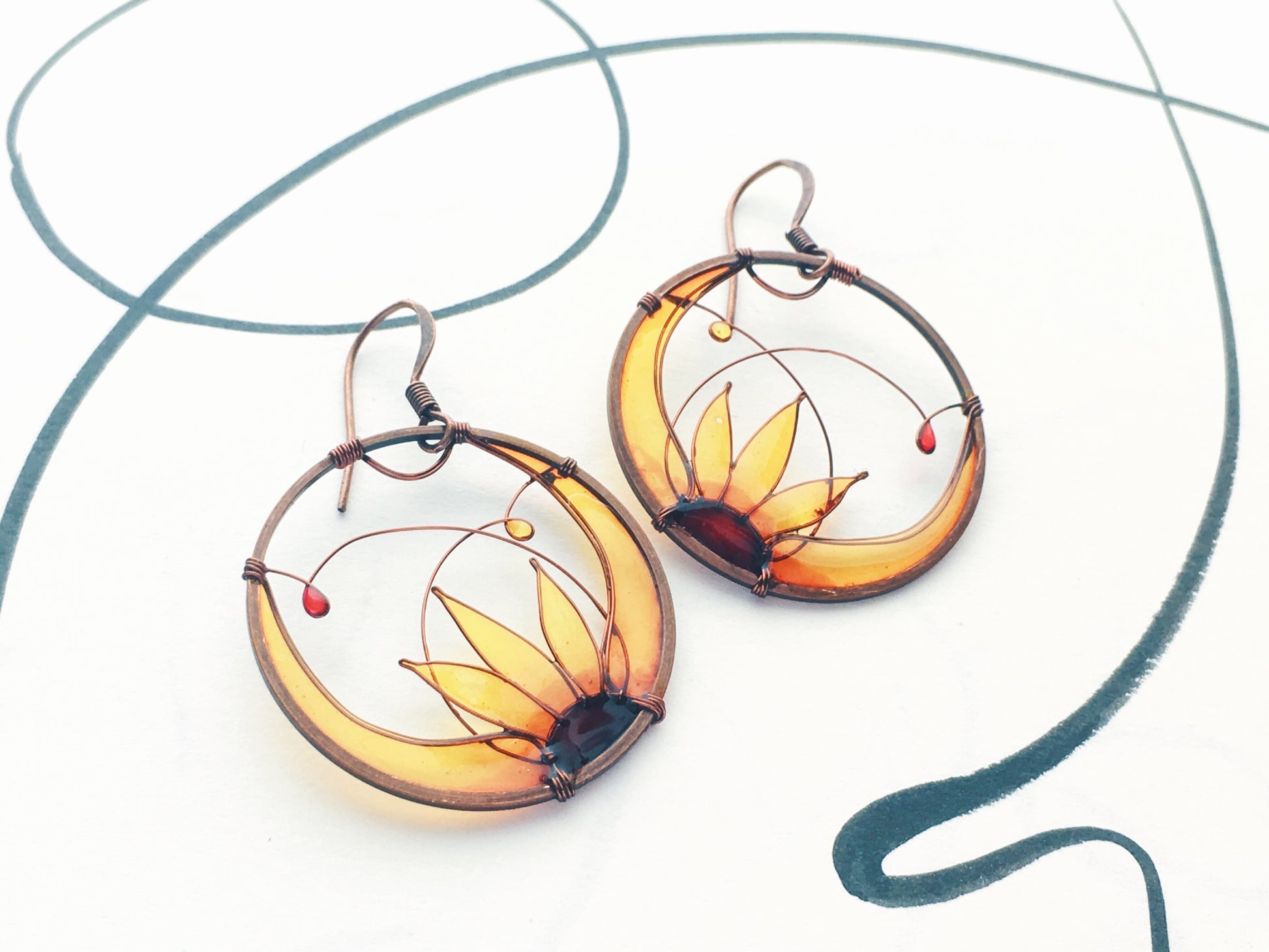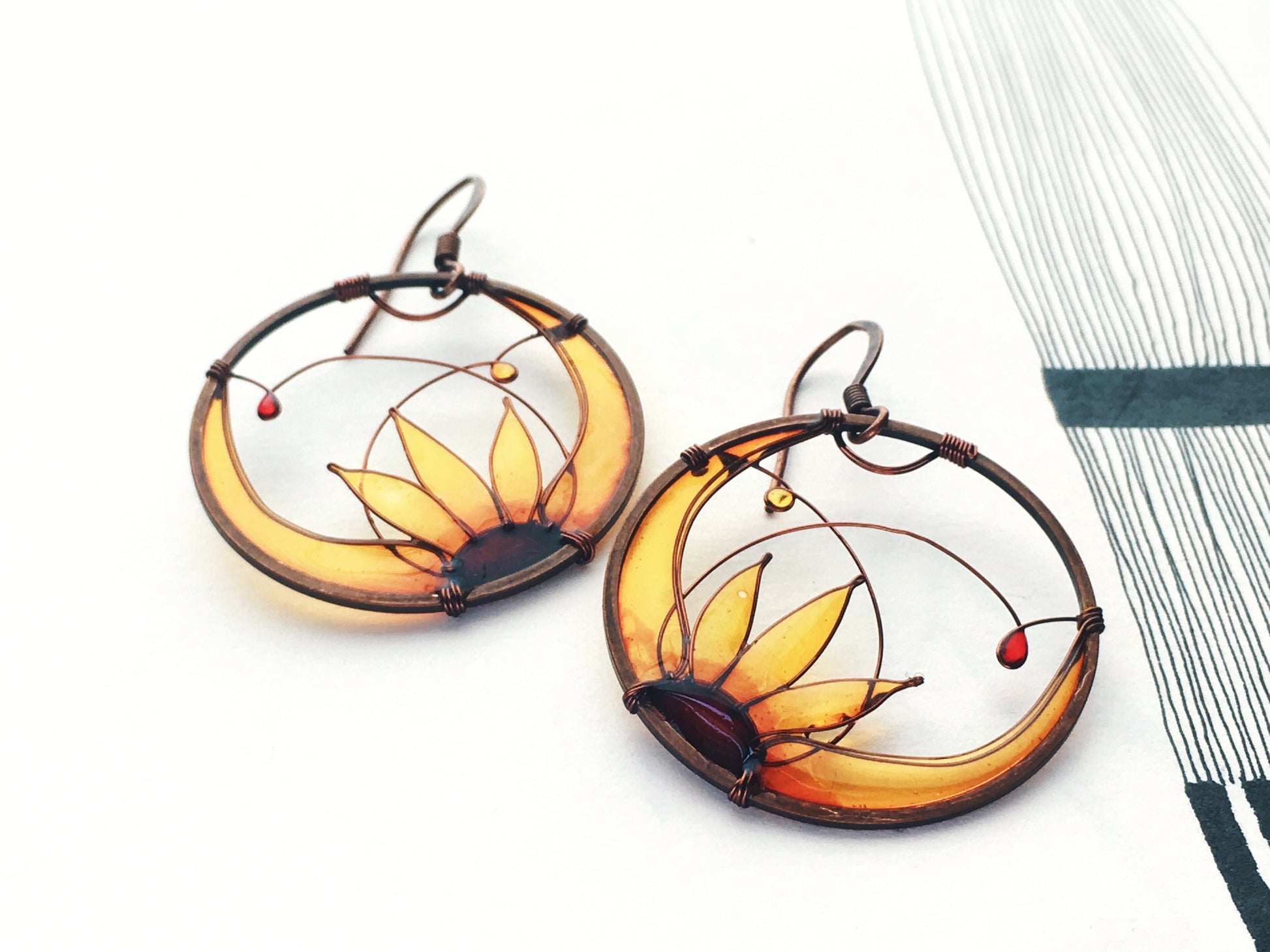 In a dark copper circle frame with thin wire I created an image of a sunflower for each earring. Then I colored each image with my glass-resin technique - the flowers have color ranging from rich vibrant honey yellow to dark amber.