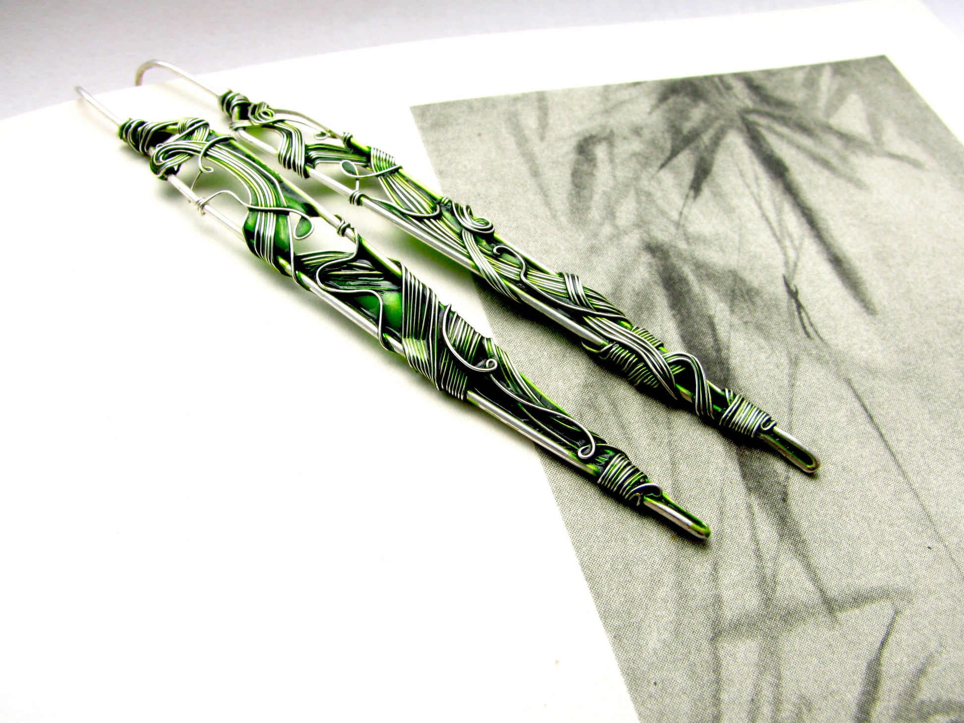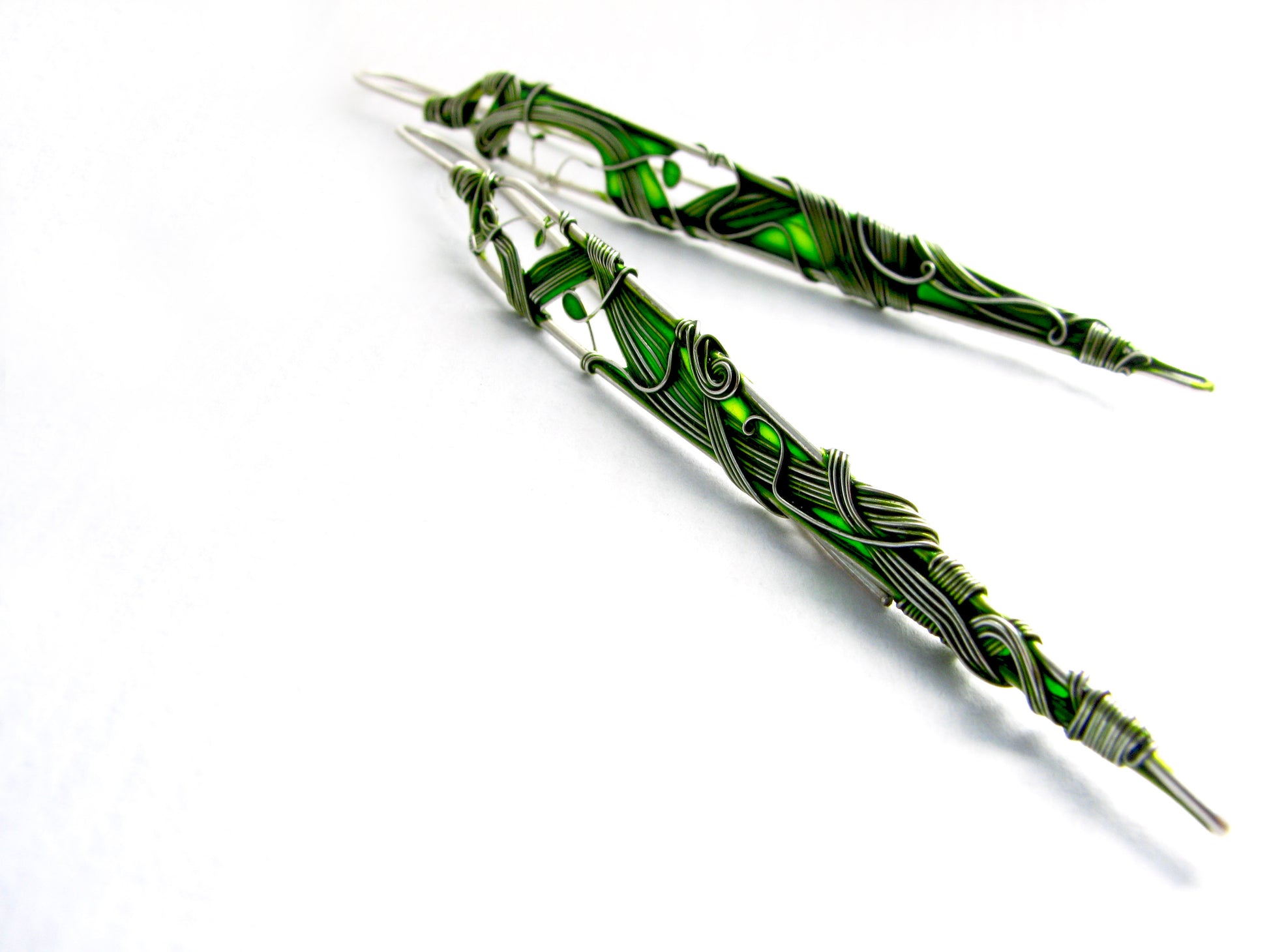 These earrings are long and delicate and showcase intricate fine silver wirework.