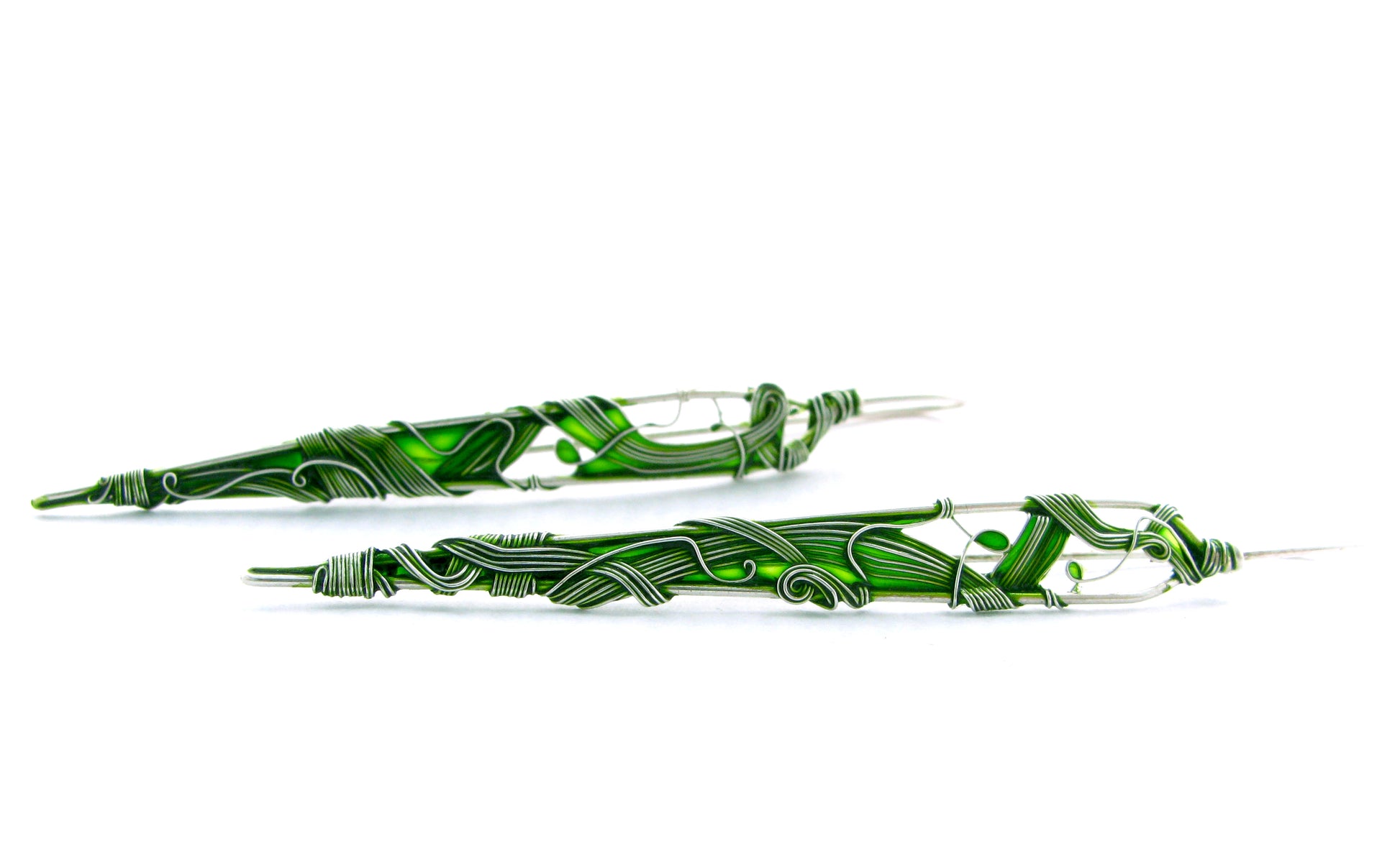 Colored with transparent green enamel, they capture the essence of stained glass with their shifting shades of green.