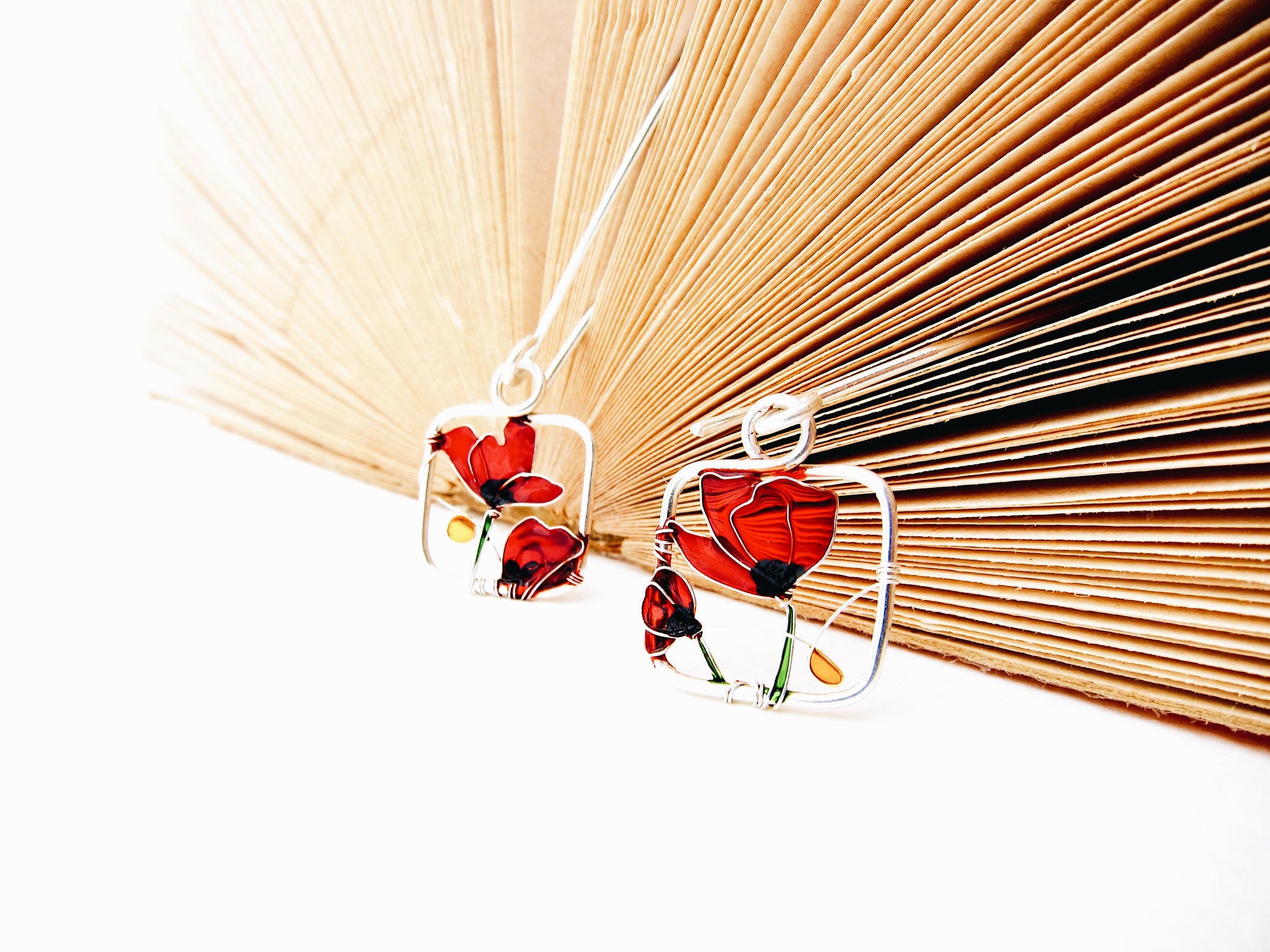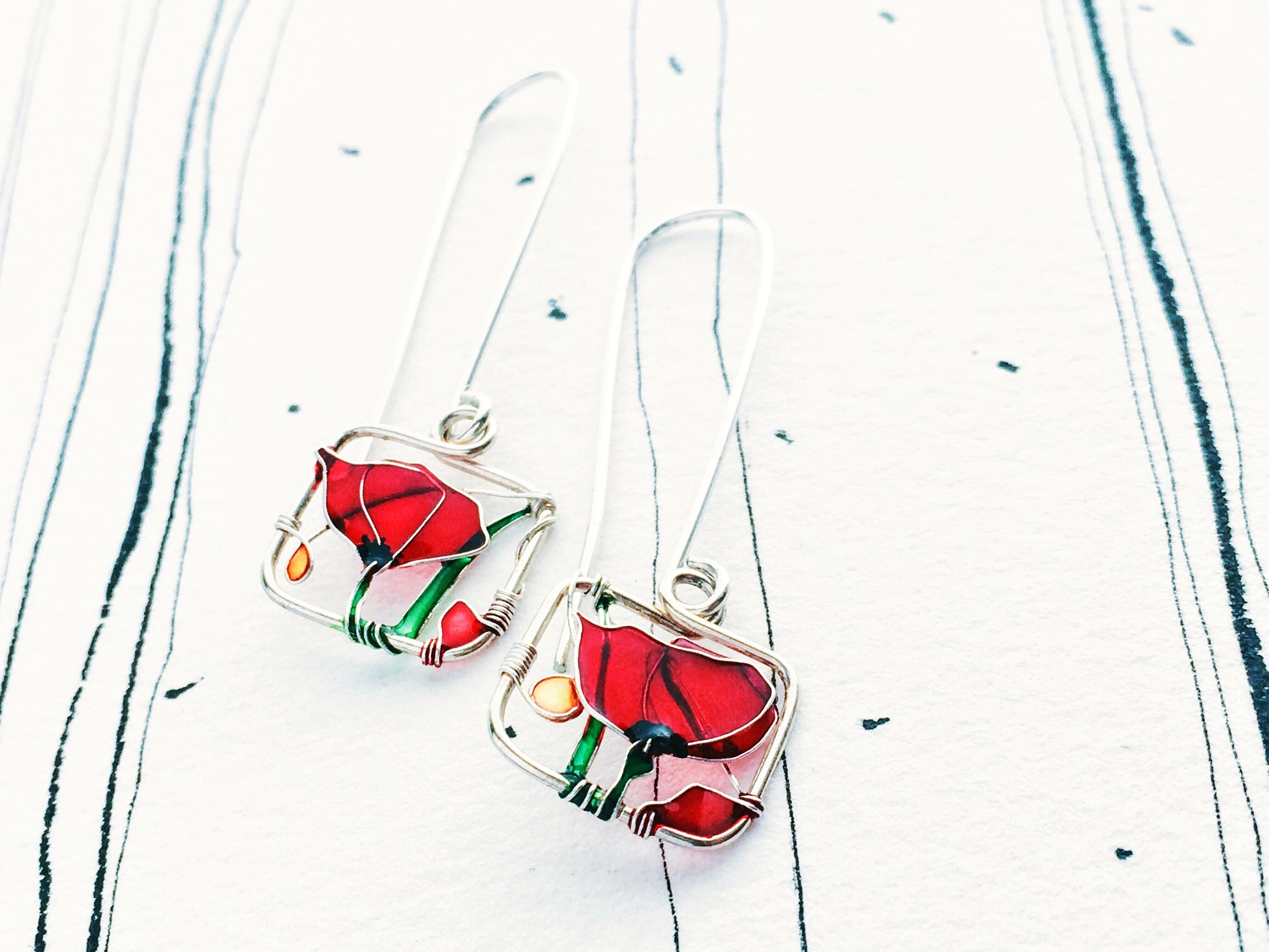 Red Poppies are earrings made with sterling silver, fine silver and glass resins. Each earring is a little rectangular frame with a picture of red poppies on a sunny day.
